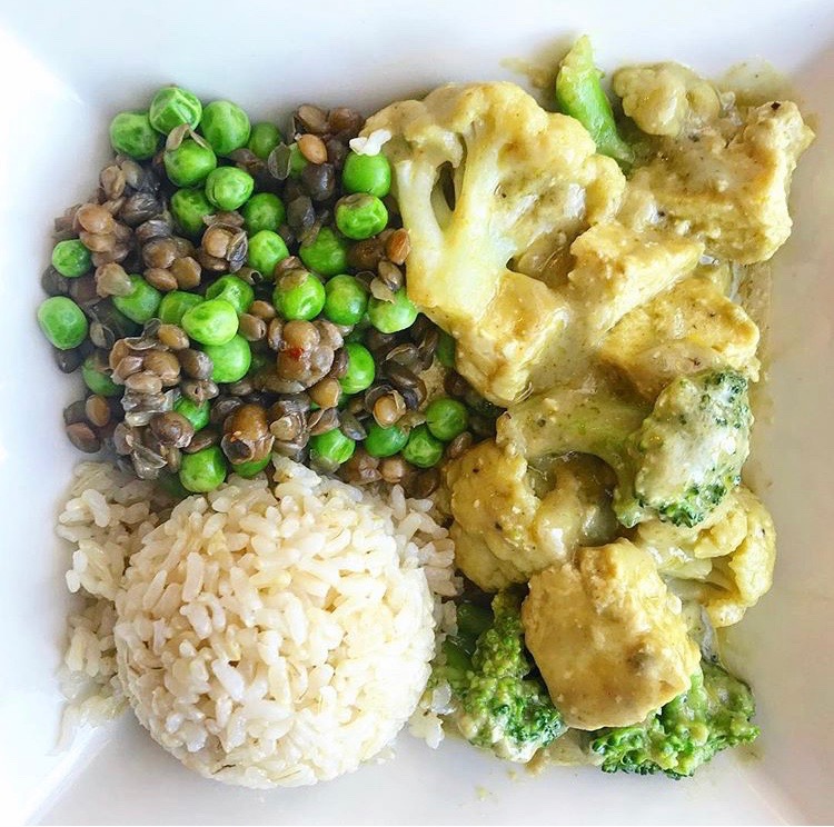 Sauté tofu, broccoli and cauliflower in 1 tablespoon of olive oil on the stove at medium heat for 4 minutes, add curry sauce and cook at a low heat for 5 minutes. Heat up pre-cooked peas and lentils in the microwave for 2 minutes and season with seasoning salt and pepper.